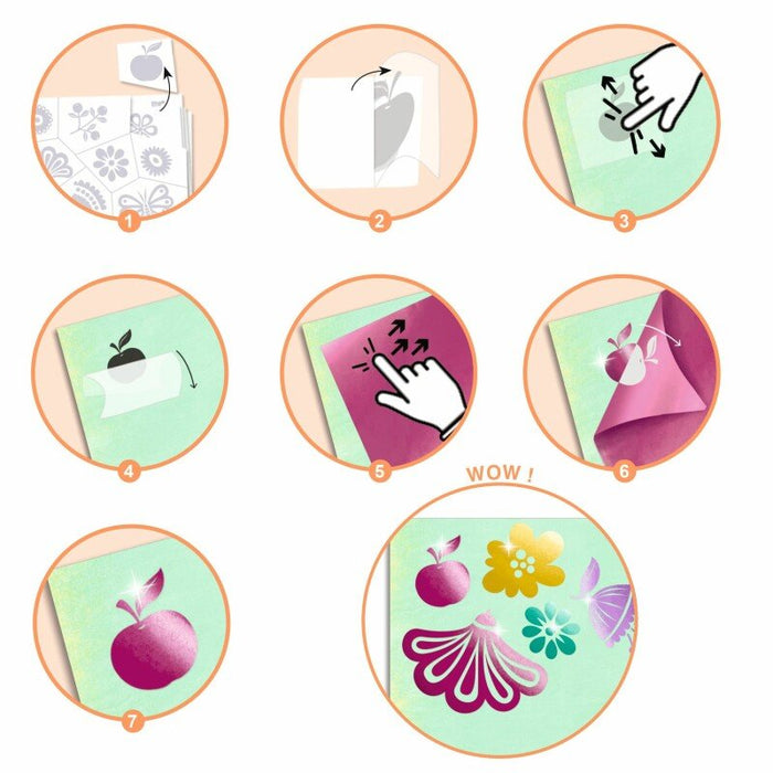 Komplekt sisaldab 12 erinevat pilti, mida saab kaunistada mitmesugustes säravates värvides liimi- ja metalllehtedega. Lapsed valivad liimilehe ja kleebivad selle enda valitud kaardile. Järgmisena valivad nad metallist ülekandelehe ja asetavad selle liimilehe peale. Originaalne ja lõbus tegevus lastele. Sobib vanusele 6 kuni 10 aastat.