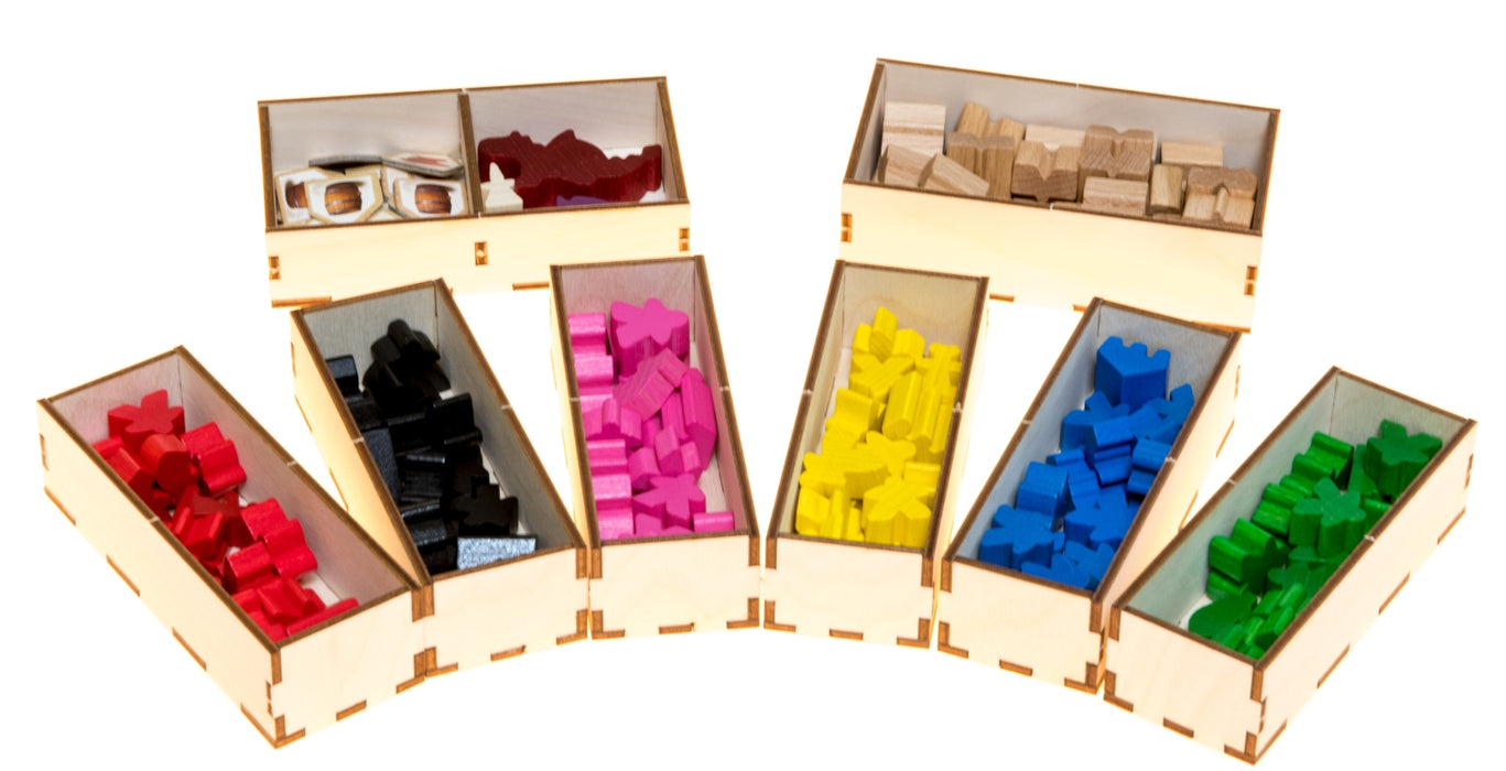 Mängijate nuppude hoiustamiseks on 6 väljatõstetavat karpi, kuhu mahuvad kõik põhimängu ja laienduste nupud.
