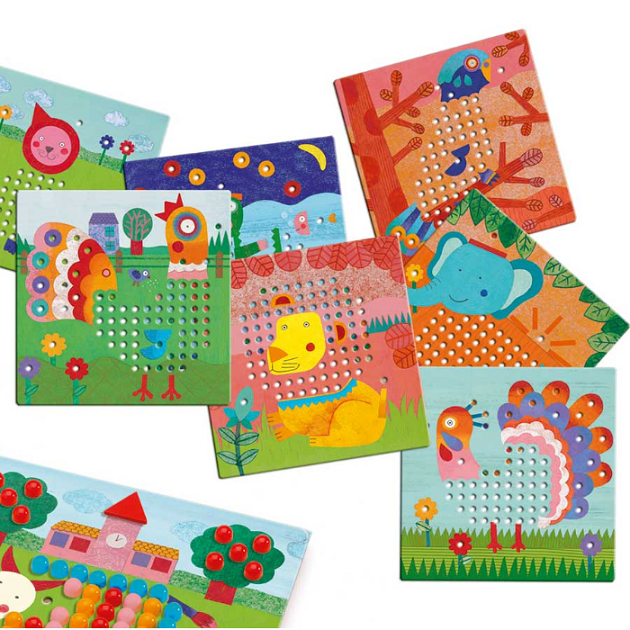 Väikeste värviliste nupukeste abil saab laps pilte kujundada. Komplektis 8 erinevat pilti, 1 illustreerimata alus ja 230 värvilist nupukest.