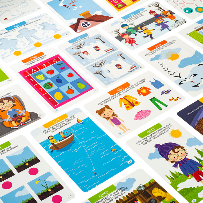 Mängida saab igal aastaajal. Eks ole? Elina ja Stefan leiavad lõbusat tegevust iga ilmaga. Nende kaartide abil õpivad lapsed paremini tundma nelja aastaaega, lahendama loogikaülesandeid, arendama tähelepanu ja mõtlemisvõimet. Pakis on 50 puhastatavat kaarti ja võlupliiats.