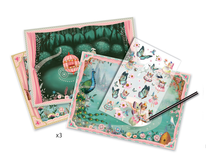 Kleebised koos taustapiltidega muinasjutumaailma teemal. Komplektis on 90 kleebist ja 3 illustreeritud taustapilti. Vali pilt ja hõõru pliiatsi või kustutuskummi abil kleebis taustapildile.